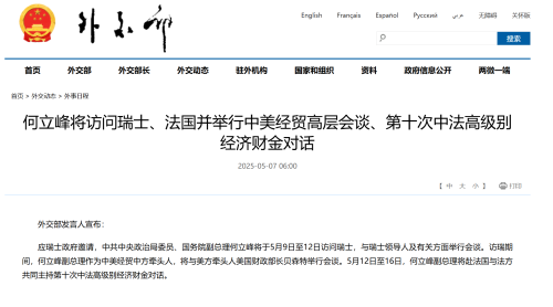 外交部发言人宣布:应瑞士政府邀请,中共中央政治局委员、国务院副总理何立峰将于5月9日至12日访问瑞士,与瑞士领导人及有关方面举行会谈。访瑞期间,何立峰副总理作为中美经贸中方牵头人,将与美方牵头人美国财政部长贝森特举行会谈。5月12日至16日,何立峰副总理将赴法国与法方共同主持第十次中法高级别经济财金对话。(外交部网站)