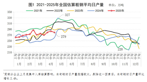 5月8日讯,2025年4月下旬,重点统计钢铁企业共生产粗钢2202万吨,平均日产220.2万吨,日产环比下降1.2%;生铁1960万吨,平均日产196.0万吨,日产环比下降0.3%;钢材2274万吨,平均日产227.4万吨,日产环比增长7.6%。据此估算,本旬全国日产粗钢279万吨、环比下降1.2%,日产生铁237万吨、环比下降0.3%,日产钢材416万吨、环比增长1.2%。受部分企业上月底集中入库结算影响,本旬钢材日产量涨幅较大,剔除这一因素后,本旬钢材日产量环比增长2.4%。