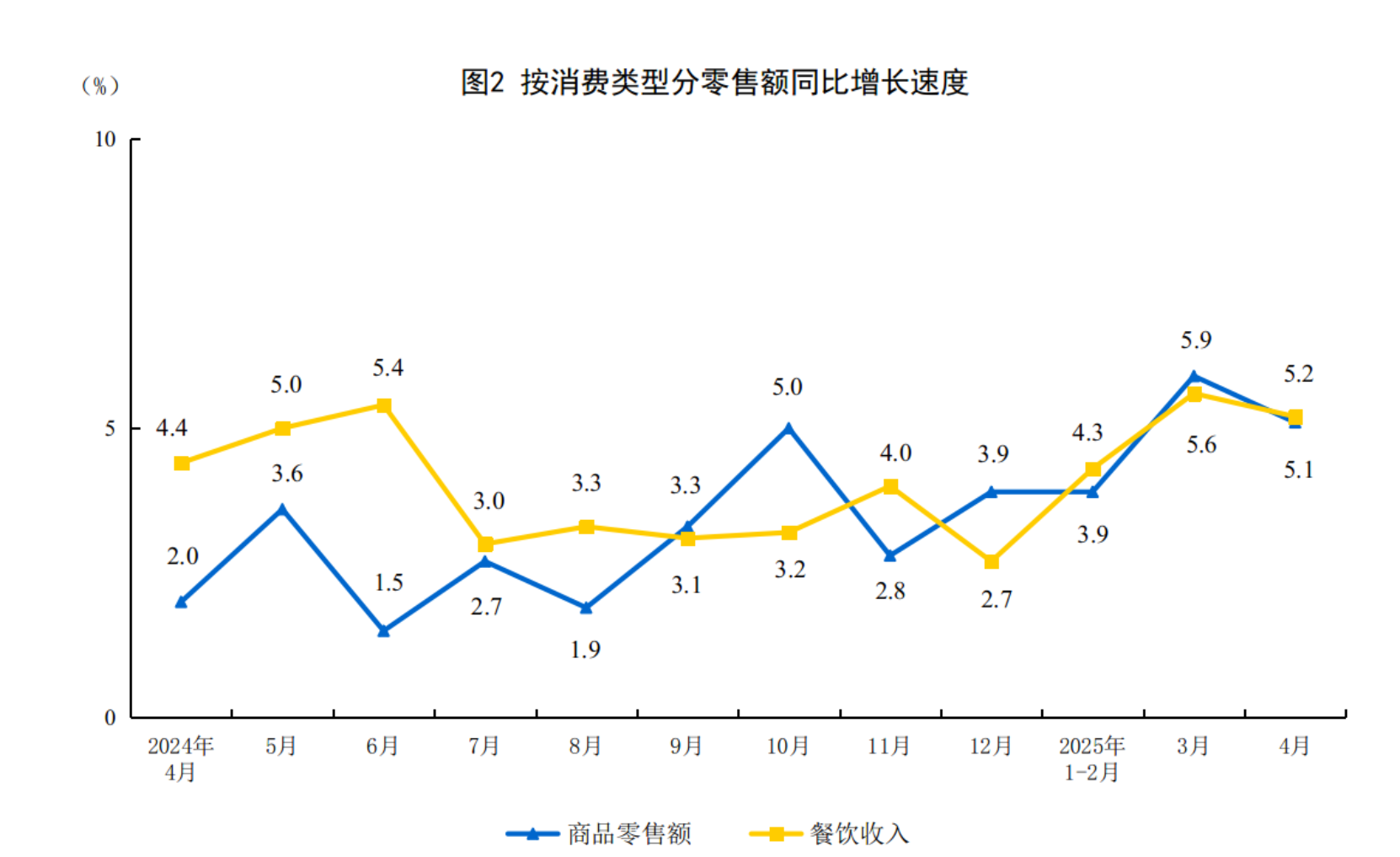 按消费类型分,4月份,商品零售额33007亿元,同比增长5.1%;餐饮收入4167亿元,增长5.2%。1—4月份,商品零售额143651亿元,增长4.7%;餐饮收入18194亿元,增长4.8%。