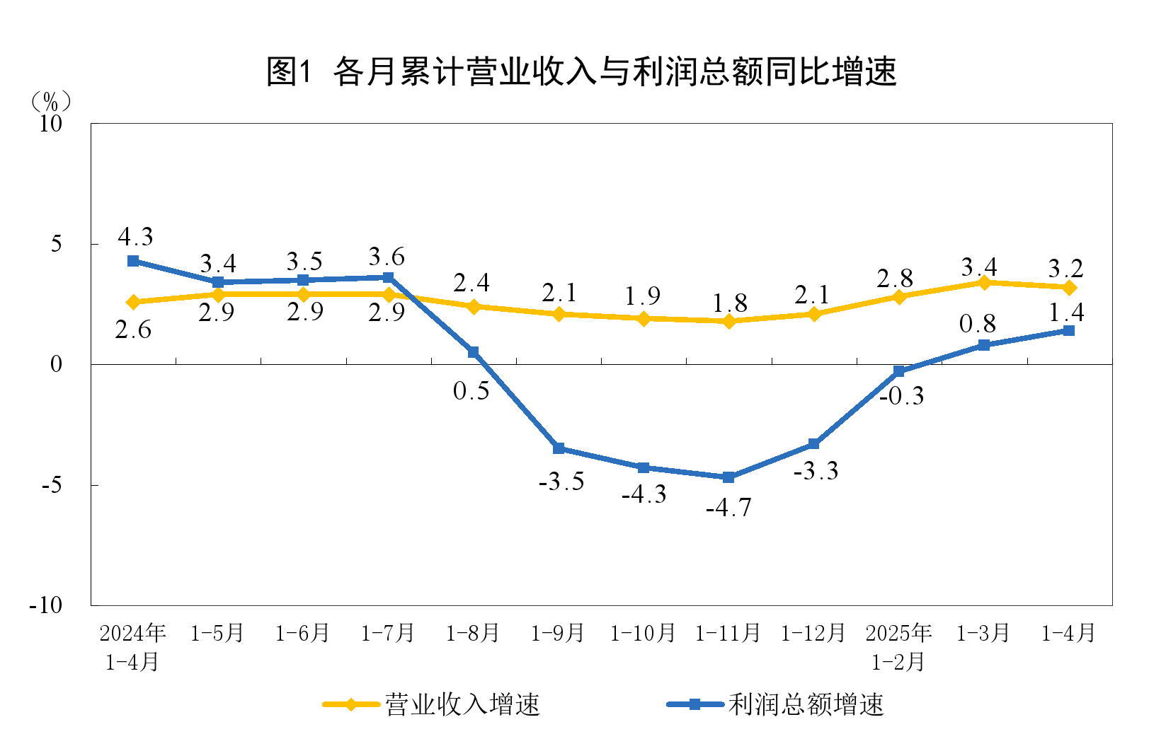 1—4月份,全国规模以上工业企业实现利润总额21170.2亿元,同比增长1.4%(按可比口径计算,详见附注二)。
