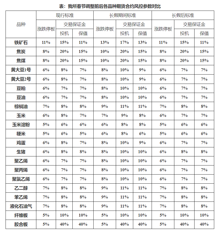 2月2日讯,自2024年2月7日(星期三)结算时起,铁矿石品种期货合约涨跌停板幅度和套期保值交易保证金水平调整为13%,投机交易保证金水平调整为17%;焦炭、焦煤品种期货合约涨跌停板幅度调整为10%,交易保证金水平维持不变;黄大豆1号、黄大豆2号、鸡蛋品种期货合约涨跌停板幅度调整为8%,投机交易保证金水平调整为10%,套期保值交易保证金水平调整为9%;玉米品种期货合约涨跌停板幅度调整为7%,投机交易保证金水平调整为9%,套期保值交易保证金水平调整为8%;豆粕、豆油、生猪、聚乙烯、聚丙烯和聚氯乙烯品种期货合约涨跌停板幅度调整为8%,交易保证金水平调整为10%;棕榈油、乙二醇、苯乙烯和液化石油气品种期货合约涨跌停板幅度调整为9%,交易保证金水平调整为11%;玉米淀粉品种期货合约涨跌停板幅度调整为6%,交易保证金水平调整为8%;粳米品种期货合约涨跌停板幅度和套期保值交易保证金水平调整为6%,投机交易保证金水平调整为8%;其他品种期货合约涨跌停板幅度和交易保证金水平维持不变。