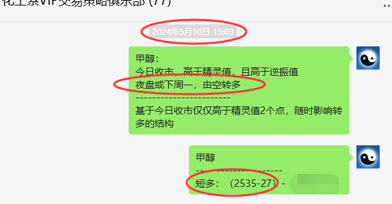 接下来为大家展示甲醇多空不同的短线转折结构,上一轮多单大家已有体会由4月25日-4月26日发生的由空转多,多单利润触及100点。那么,今日我们再为大家展示甲醇从上周五收市再次发生短线由空转多的结构。大家通过盘面的K线多空转折结构可以直观看到,前一波由5月7日至5月10日的回撤,连续进行了4个交易日的调整,完成短线空单近60点的利润,同时,就在5月10日收市,甲醇具备了再次由空转多的条件。之后两个交易日表现非常出色,因为这个转多结构让人最幸福的时刻就是突破了前高,突破已经是规则中预期的结构,让人喜悦的是仅仅两个交易日就完成多单超100点的利润。对此,我们在13日的夜盘提示VIP用户,价格回升至2640附近实现对多单的减仓。友好的突破,利润的获取,这就是简单的快乐。幸福还在持续发生,因为甲醇回撤2576附近,我们提示VIP用户开始执行对2635空单的二次减仓。单日空单利润约55点左右。对此,从今日收市来看,VIP用户不但完成了多单超百点的减仓利润,同时还有应对空单完成超50点的利润,一举两得。